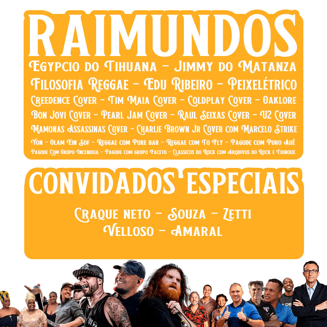 Shows Principais: Mamonas Assassinas Cover, Pearl Jam Cover, Bon Jovi Cover, Coldplay Cover, Charlie Brown Jr. Cover com Marcelo Strike, Spoilers com Egypcio do Tihuana e Jimmy do Matanza, além dos poderosos Raimundos. 🎶