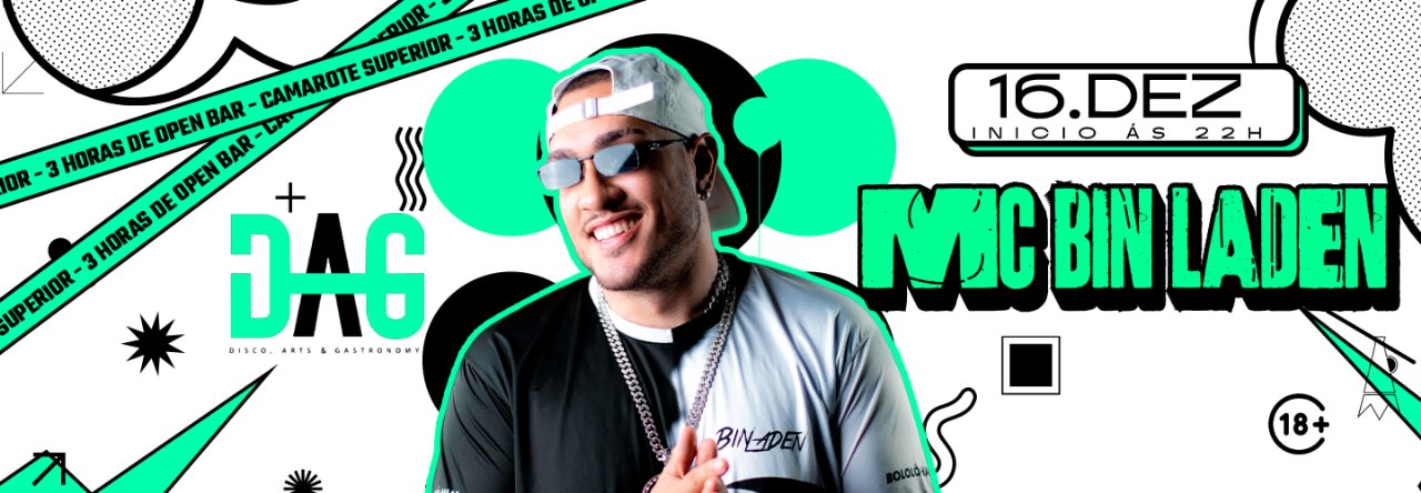 Prepare-se para uma noite única na DAG Club com o show imperdível de MC Bin Laden! 🔥 Garanta já o seu ingresso e faça parte desse evento que promete agitar a cidade. Proibida a entrada com bebidas, mas não se preocupe, teremos 3 horas de open bar exclusivo no camarote superior. Lembrando que é restrita a entrada de menores. O evento acontecerá no dia 16 de dezembro, com início às 22h. Não perca essa oportunidade de viver uma experiência inesquecível! 🎤🚀 #MCBinLaden #DAGClub #OpenBar