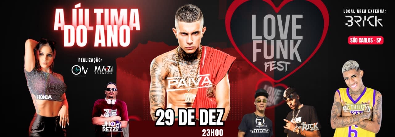 Tá ligado, família? A última do ano tá confirmadíssima! Dia 29 de Dezembro, às 23h, é o rolê da virada na Brick em São Carlos! 🔥 Quem tá botando ordem na festa é a Love Funk Fest, e olha só as atrações de respeito que eles trouxeram: MC PAIVA, DJ HONDA, MC RHEUZYN, DJ JHOREZZ, ANTONY e MC RICK! Isso sim é que é pancadão de qualidade! 🔊💃