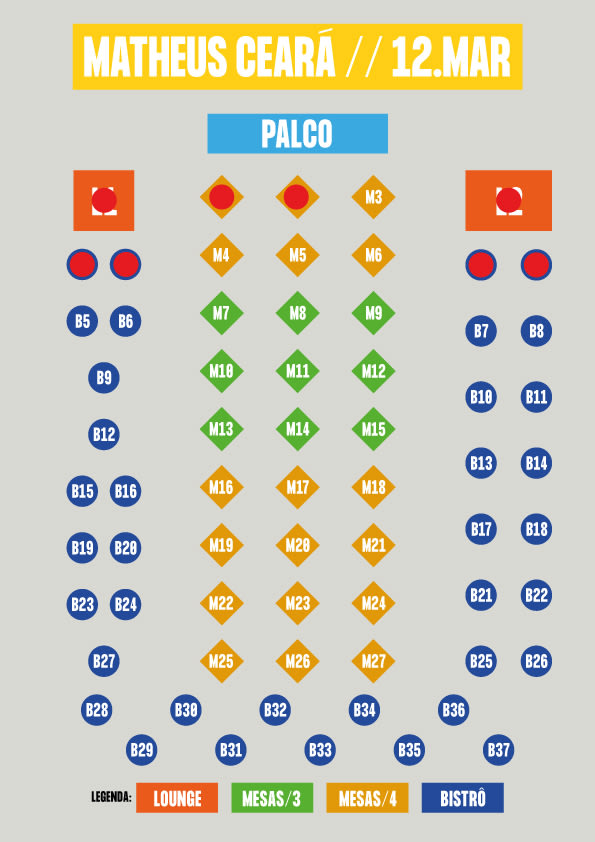 Obs: As mesas disponíveis no mapa será por ordem de chegada na casa, as demais marcadas como "Vendido" não estão mais disponíveis, foram comercializadas no BORA para quem estava na edição anterior do BORA DAR RISADA.