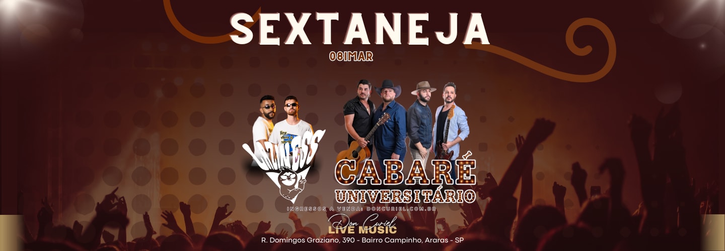 Sexta-Feira é dia de Cabaré Universitário (Fábio Menezes & Felipe + Thomaz Henrique & Gustavo) no palco do Don Curiel Live Music. Pra completar a noite, a dupla de DJ Laziness comandam a nossa pista.