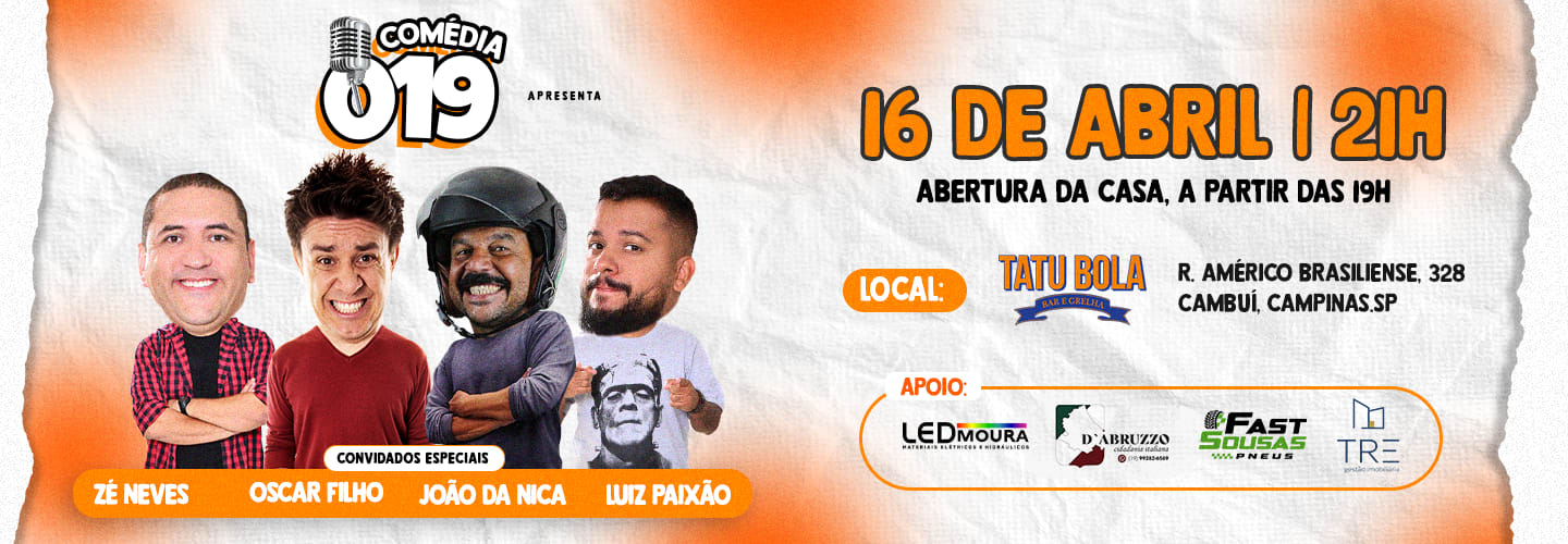 Pra começar, receberemos o campineiro João da Nica, o motoboy mais famoso do Brasil, sucesso absoluto nas redes sociais. E, pra completar, um dos maiores humoristas do país: OSCAR FILHO! Um dos precursores do stand up comedy no Brasil e ex-integrante do revolucionário CQC! Essas duas lendas vão participar do show de comédia que conquistou a cidade.