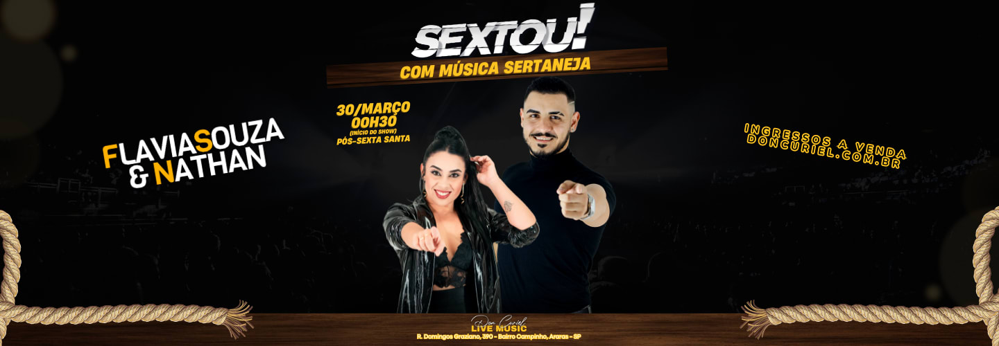 Sextou com gostinho de Sabadon no Don Curiel Live Music. Nós sabemos que hoje a Sexta-Feira é Santa e pensando nisso... pra fechar esse feriado com chave de ouro a dupla Flávia Souza e Nathan traz aquele sertanejo pra ninguém ficar parado a partir da 00h30!