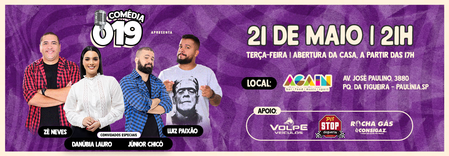 Chegou a hora de curtiu mais uma edição do COMÉDIA 019 no AGAIN BAR, em Paulínia. O show que conquistou a região chega no mês de MAIO com dois convidados mais do que especiais: DANÚBIA LAURO e JUNIOR CHICÓ, dois dos melhores humoristas do Brasil. Danúbia e Chicó têm estilos de comédia diferentes, personas diferentes, mas que divertem TODOS os públicos. Você vai ficar de fora desse show? Não, né? Esperamos você lá!