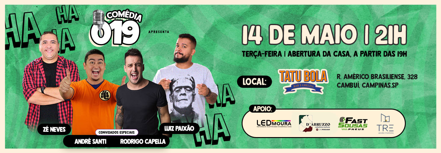 Luiz Paixão e Zé Neves O show de comédia stand up no Tatu Bola, no Cambuí, continua a todo vapor e os anfitriões Luiz Paixão e Zé Neves capricharam mais uma vez nos convidados! Em MAIO teremos a presença de André Santi e Rodrigo Capella, dois dos melhores humoristas do Brasil.