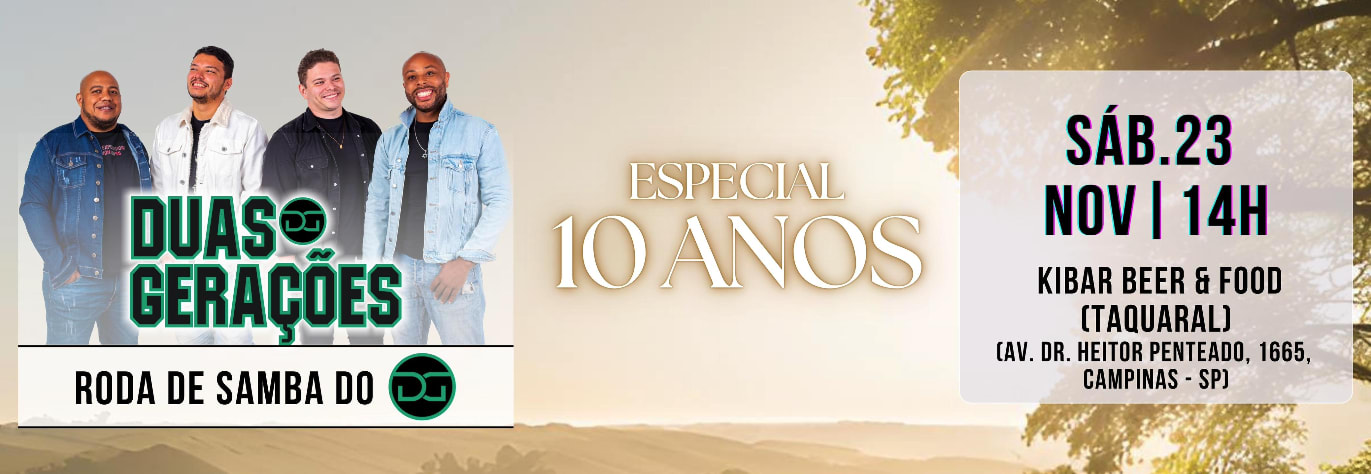 O Grupo Duas Gerações está completando 10 anos de existência em 2024 e nada melhor do que comemorar em grande estilo, fazendo aquela roda de samba tradicional, com nossos convidados e amigos, em um ambiente maravilhoso. Vai ser lá no Kibar Beer & Food (CT Kinesis) em frente a Lagoa do Taquaral (Portão 2).