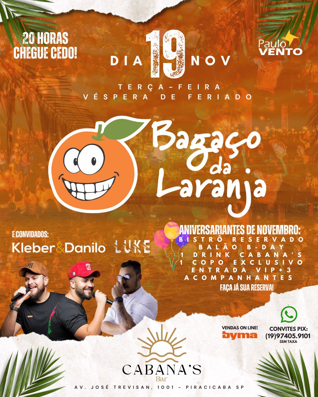 Após o grande sucesso da Inauguração o Cabana's Bar abre as portas na véspera de feriado para receber a roda de samba e pagode mais famosa de Piracicaba e Região!