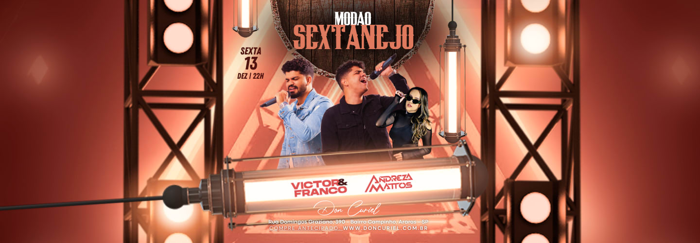 Quem vem pra animar a nossa noite é a dupla sertaneja Victor & Franco com os melhores modões! Pra completar a nossa Line, DJ Andreza Mattos comanda a pista do Don!