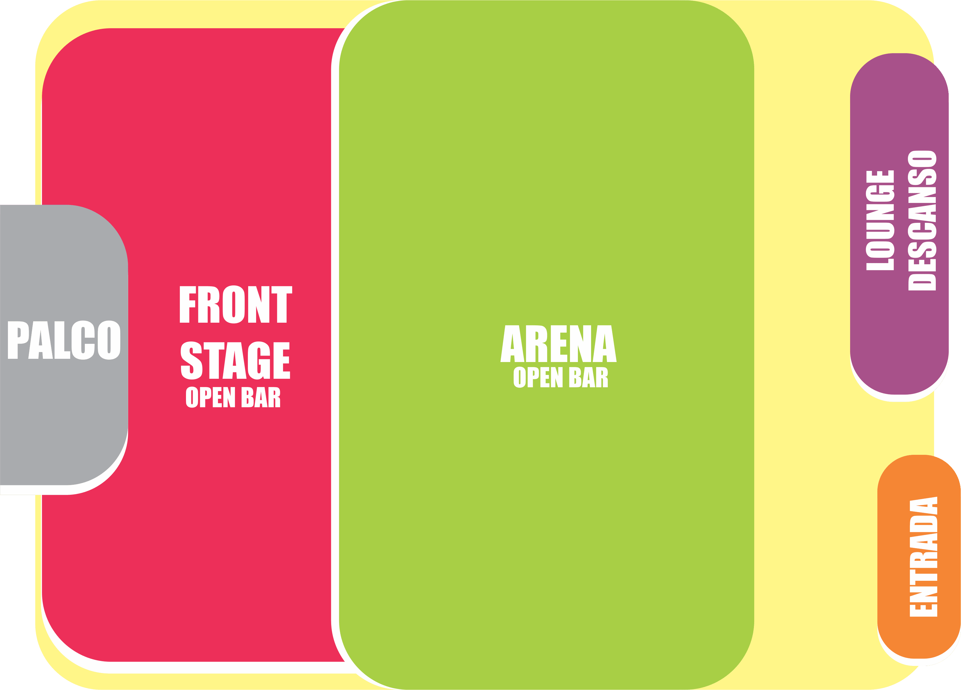 - Front Stage Open Bar: Cerveja Brahma e Antarctica Boa, Vodka, Gin, Energético, Suco, Refri e Água. Acesso a frente do palco.