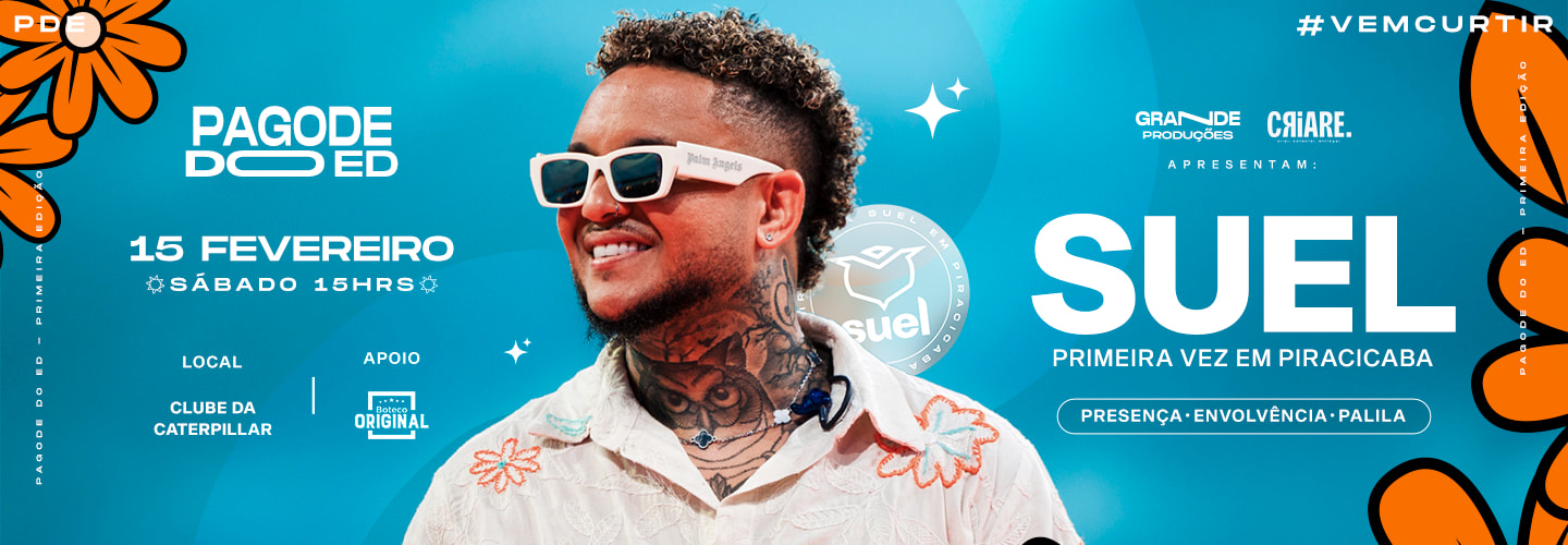 Conhecido pelos sucessos "Duvido", "Para de Pirraça", "Me Assume ou Me Esquece" e "Pretexto", que conquistaram o Brasil, Suel vem com um show completo pela primeira vez na cidade! Prepare-se para uma noite inesquecível!