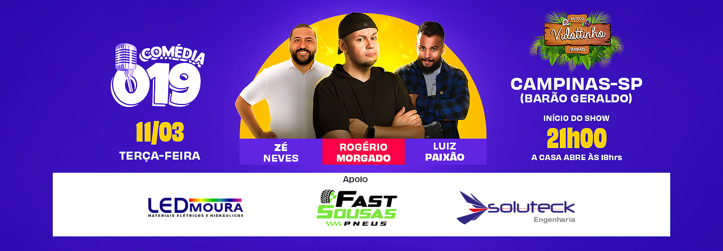 O COMÉDIA 019 sempre traz os melhores shows de comédia stand up pra Campinas e dessa vez não será diferente! O convidado da vez é ROGÉRIO MORGADO, um dos maiores humoristas do Brasil, diretamente do Pânico para Barão Geraldo. Você não vai perder esse show, né?