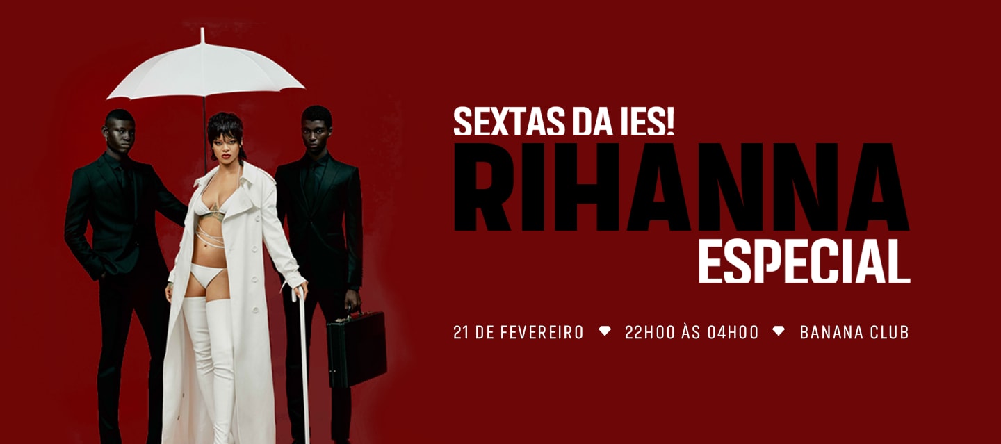 Vamos ouvir muita Rihanna sim, mas vai ser com REPÚDIO! QUEREMOS MÚSICAS NOVAS, ROBYN FENTY! Nessa edição da Sexta da IeS, revisitaremos os 8 álbuns lançados entre 2005 e 2016, incluindo singles e não-singles, numa noite recheada de muita música pop e aquela pitada de funk que a gente ama! 💋