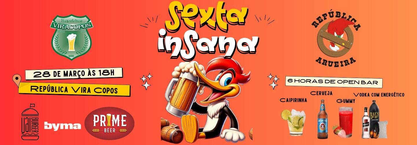 Nesse clima de voltas ás aulas, nada melhor que mais uma edição da tradicional SEXTA INSANA, para começar o período da melhor forma!! As repúblicas Vira Copos e Arueira vão trazer para vocês o rolê mais insano de todos para quebrarmos tudo nesse início de período.
