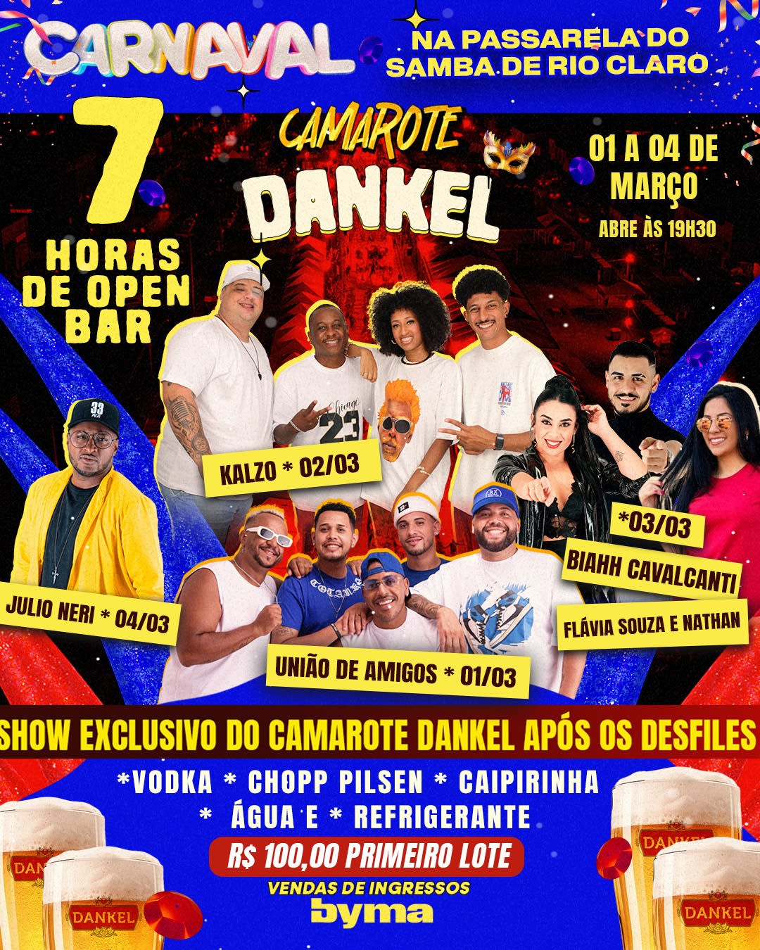 O Chopp Dankel, em parceria como Rei do Chopp e Vila do Chopp, vão montar o melhor Camarote de Rio Claro- com 7 horas de Open bar, durante o desfile e mais um grupo de pagode no final!!