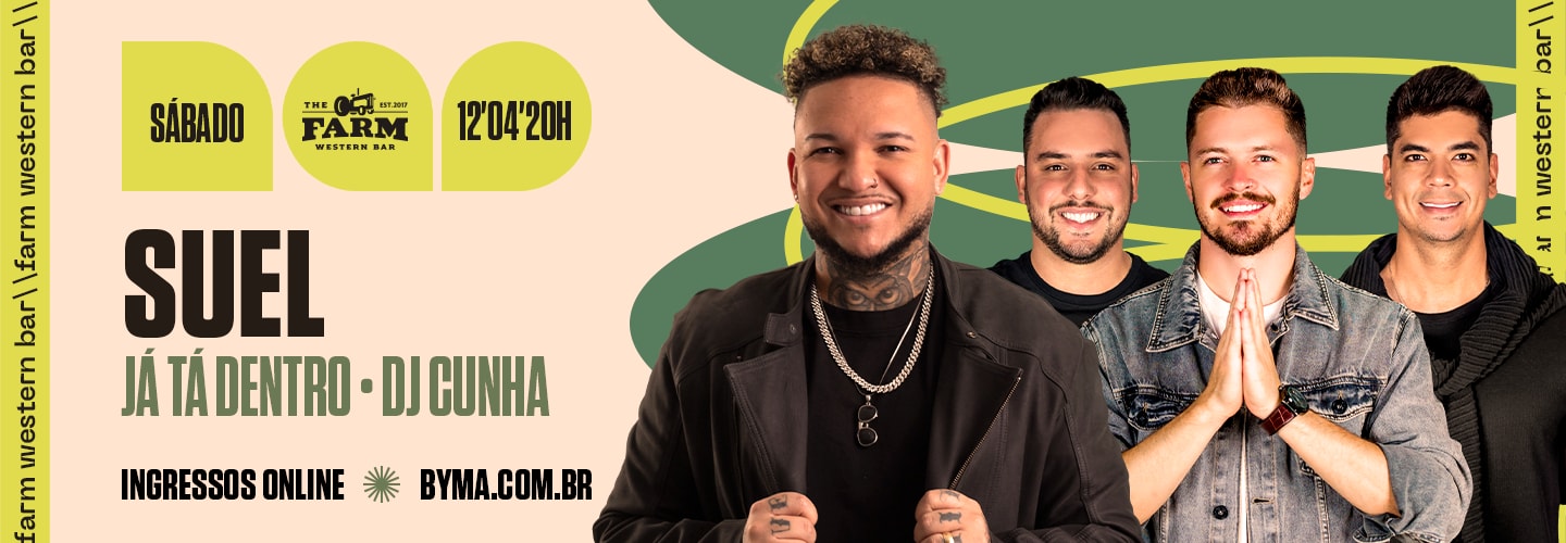 No dia 12/04, a partir das 20:00, o cantor Suel vai agitar o palco do The Farm com muito pagode e hits como "Me Assume ou Me Esquece" e "Vitamina C", que estão bombando em 2025! 🔥🎶