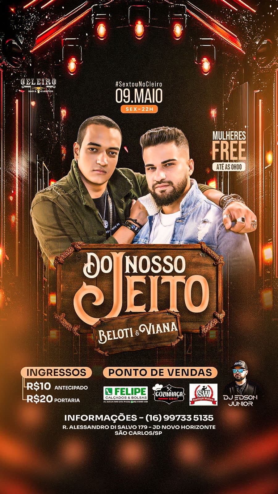 Dia 09/05 tem Beloti & Viana quebrando tudo aqui no Celeiro, e já sabe: mulherada FREE até a 00h 🔥