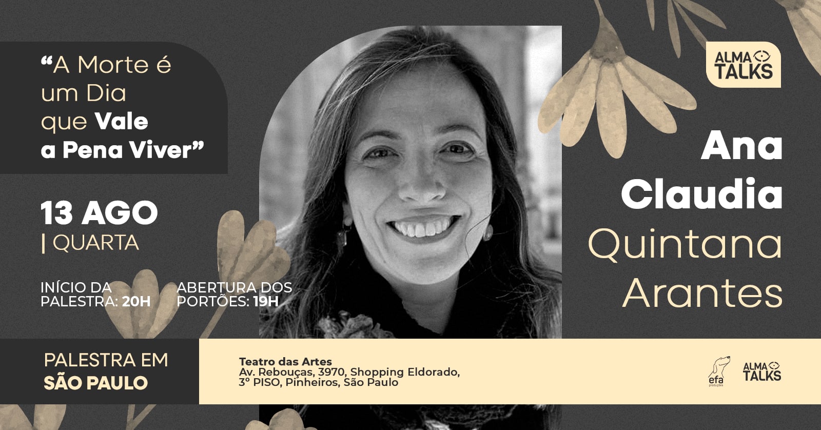 Este evento não é uma exposição sobre técnicas ou teorias. É uma travessia guiada por uma profissional que fez da morte um instrumento para ensinar sobre a vida. Empregando uma linguagem sensível, Ana Claudia traz ao palco um convite ao despertar de uma consciência mais ampla sobre o tempo que temos e o que escolhemos fazer com ele.