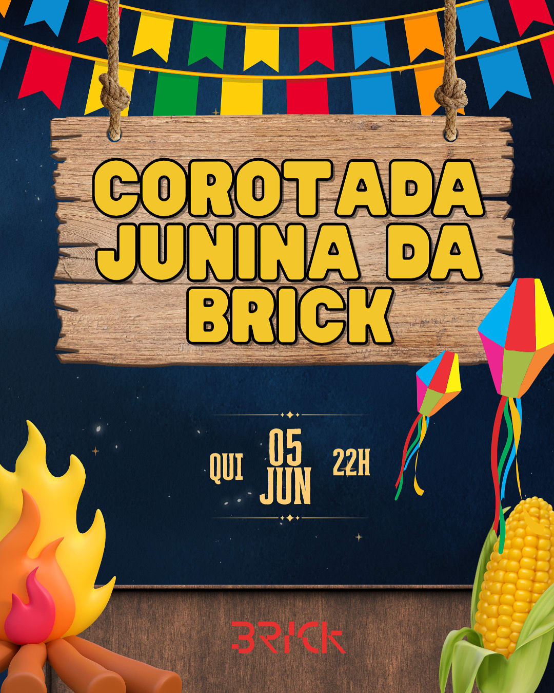 Nessa quinta-feira, prepara a camisa xadrez, a bota (ou o crocs) e vem pra COROTADA JUNINA DA BRICK! 🎉