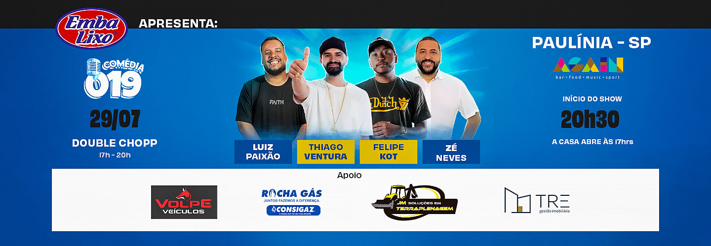 SE LIGA CACHORRO!! Você já sabe: o AGAIN BAR é casa do stand up comedy em Paulínia, certo? E é com imensa satisfação que os anfitriões Luiz Paixão e Zé Neves te convidam pra mais um showzaço de humor! O Comédia 019 tem a honra de receber o hilário Felipe Kot e o fenômeno THIAGO VENTURA! Já avisa a galera que Paulínia tem local, dia e hora pra parar! E a gente espera você lá, fechou? ATENÇÃO: É SESSÃO ÚNICA! Não vacila e garanta sua mesa!
