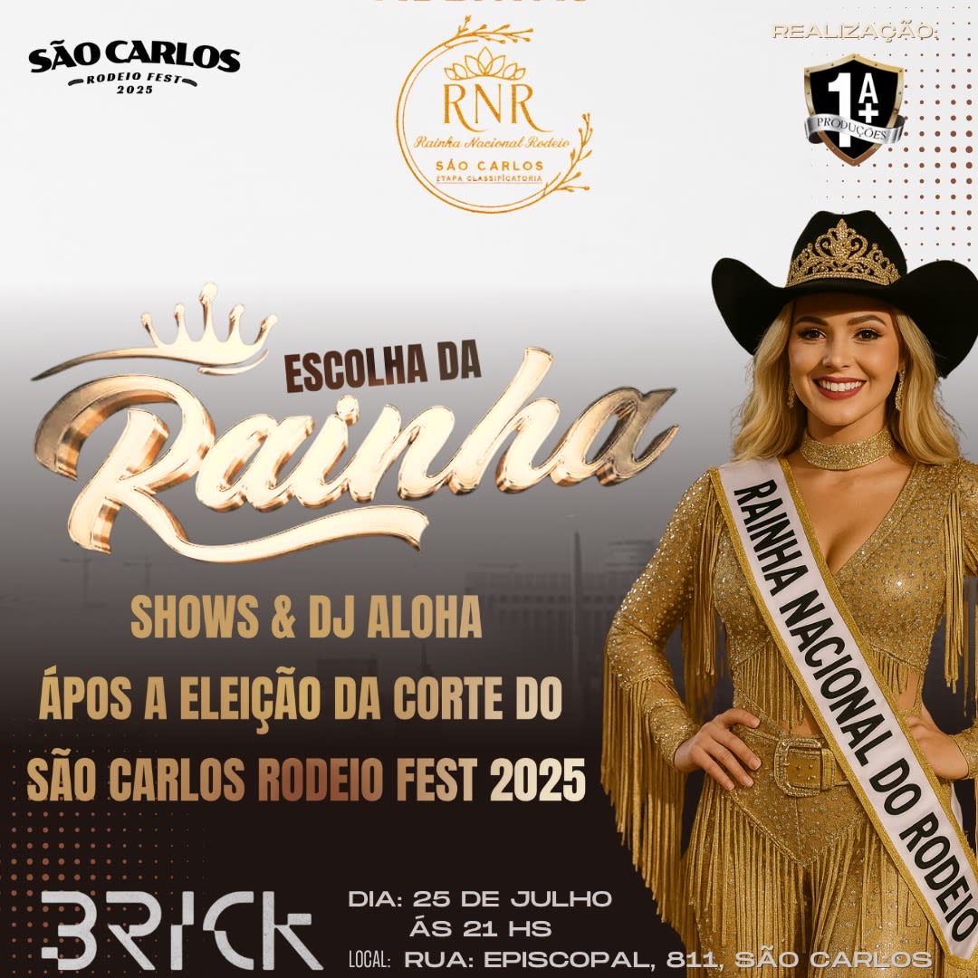 São Carlos Rodeio Festival apresenta o baile da Rainha do Rodeio, a partir das 21h na BRICK eventos, ate as 4hm com várias bandas sertanejas e djs convidados, vamos escolher a Ranha do Rodeio, e fazer aquela festa!!! Convites Antecipados com desconto!!! Disponiveis na porta com alteração de valores, garanta o seu!!!