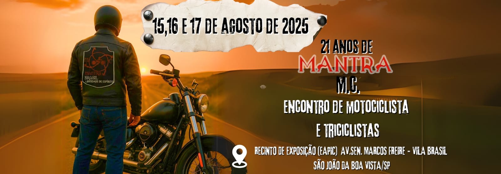 O Mantra M.C. celebra 21 anos de estrada com um encontro que vai estremecer o asfalto! Três dias de irmandade biker, rock pesado, shows tributo (Raul Seixas, Kiss, Capital Inicial e muito mais), expositores, praça de alimentação, camping coberto, chuveiro quente, café da manhã e espaço para motorhome.