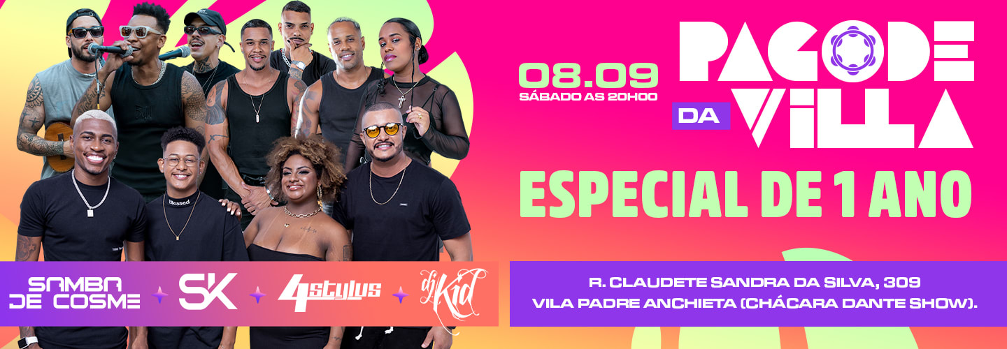 Prepare-se pra uma edição histórica! O Pagode da Villa completa 1 ano de muita resenha, música boa e energia contagiante, e claro, essa comemoração vai ser em grande estilo!